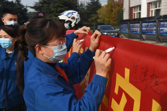 公司员工与公安交警共同在“文明交通,安全出行,骑乘电动自行车请佩戴安全头盔”的红色条幅上签名,在郑重做出文明出行承诺的同时,将安全文明出行的理念镌刻在心中。