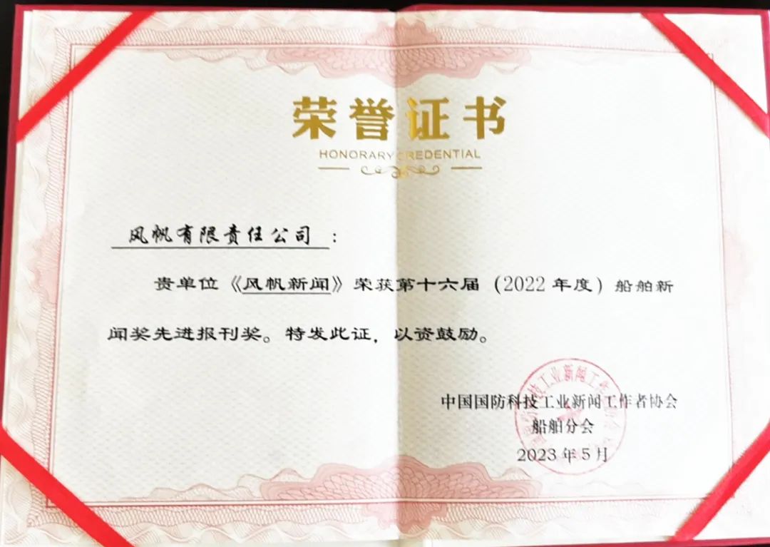 在2023年全国船舶新闻业务培训班暨“船媒”厦门行活动中,中国国防科技工业新闻工作者协会船舶分会揭晓了第十六届船舶新闻先进/优秀企业报刊奖和第二十七届船舶新闻奖获奖名单,公司《风帆新闻》荣获船舶新闻奖先进报刊奖。