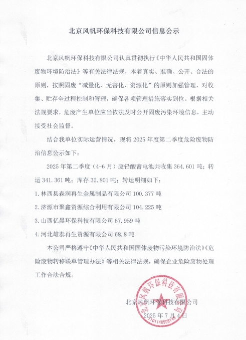 北京风帆环保科技有限公司2025年第二季度危险废物防治信息公示